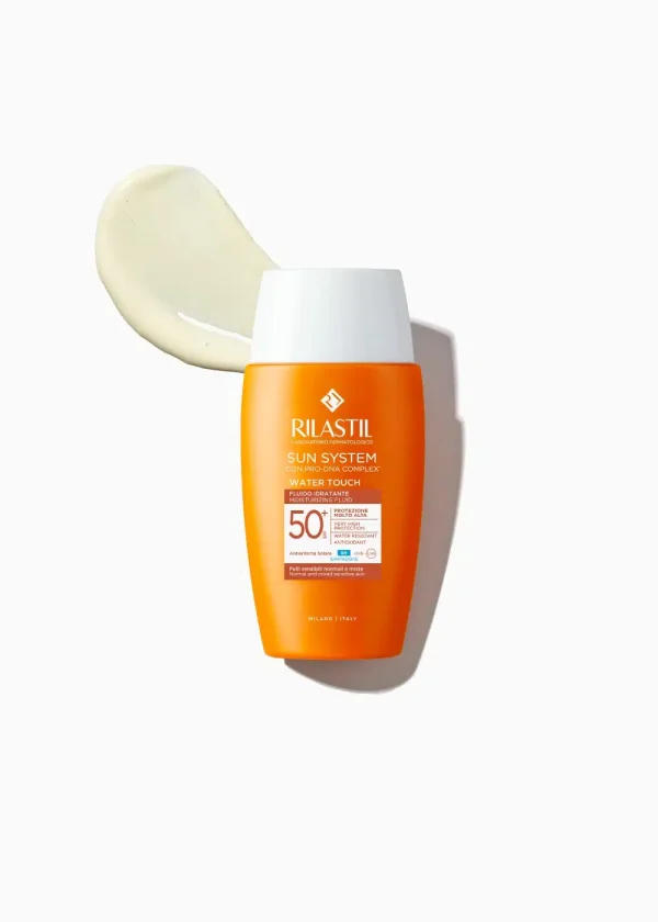 Rilastil Sun System Water Touch Fluid SPF50+ je ultra lahka, svilnata emulzija za obraz, ki nudi visoko UVA/UVB zaščito 🌞. Nežno matira, vlaži in zmanjša videz por – popolna izbira za mešano ali mastno kožo.